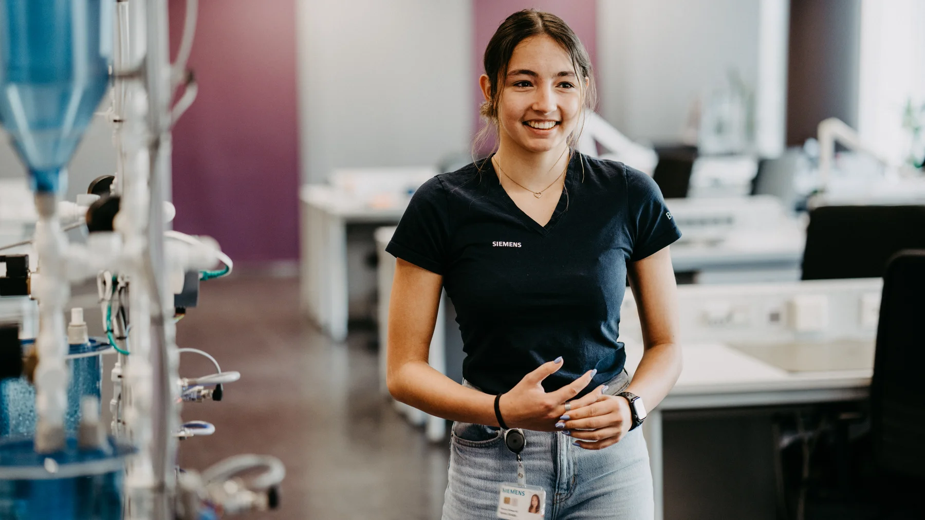 «Es war der gleiche Lehrer, der mir empfahl, am Meitli-Technik-Tag von Siemens teilzunehmen. Da wurden die drei Berufe Elektroniker/in, Automatiker/in und Informatiker/in vorgestellt. Bei Automatiker/in wusste ich sofort: Das ist das, was ich machen will. Nicht nur am Computer sitzen, sondern auch handwerklich tätig sein – aber eben nicht nur. Das hat mich fasziniert. Wir durften eine Platine programmieren, so dass sie anschliessend blinkte. Da habe ich den ganzen Ablauf gesehen: Vom Zusammenbauen übers Löten und Programmieren. Was mir am Automatiker/Innen-Beruf gefällt, ist, dass ich sofort ein Resultat sehe. Ich denke mir eine Struktur aus und sehe anschliessend ein Produkt, das genau das macht, was ich mir ausgedacht hatte. Das ist sehr motivierend. Zudem arbeitet man als Automatiker/In eng mit verschiedenen Experten zusammen, da es überall Schnittstellen gibt. Taucht einmal eine Frage auf, weiss man sofort, wer einem dabei weiterhelfen kann. Diesen Team-Spirit schätze ich sehr. Der Meitli Technik-Tag motivierte mich, mich für eine Automatiker/Innen-Lehre bei Siemens zu bewerben. Dass dies gelang, freut mich immer noch sehr.»