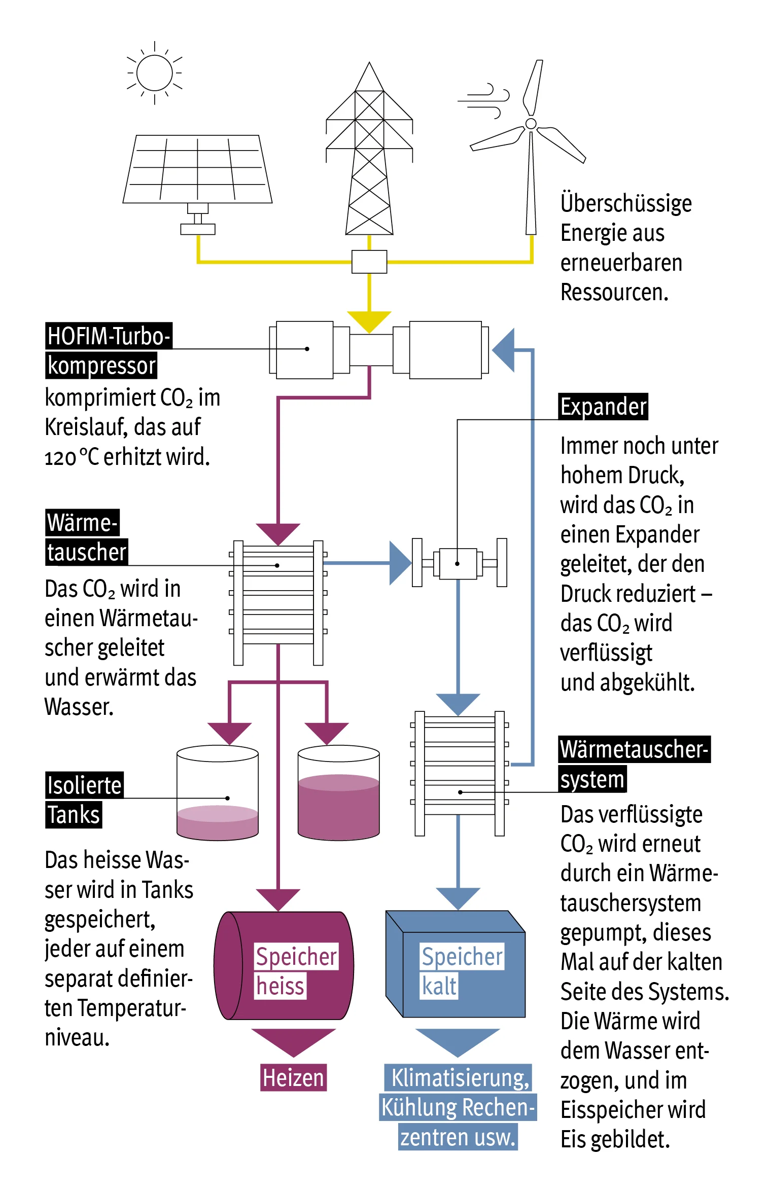 Das Grundprinzip des ETES ist die Umwandlung von elektrischer Energie in thermische Energie mittels Speicherung als Warmwasser und Eis. Dabei arbeitet das System nach dem gewöhnlichen Wärmepumpenprinzip: Ein Kältemittel, in diesem Fall CO2, wird in einem geschlossenen Kreislauf durch Druckerhöhung erhitzt und anschliessend wieder abgekühlt. Für diesen Prozess nutzt ETES erneuerbare Energien. Die freigesetzte Wärme und Kälte werden in getrennten Reservoirs gespeichert oder direkt an die Verbraucher verteilt. Einzigartig ist dabei, dass die gespeicherte Wärme und Kälte auch jederzeit in Strom zurückverwandelt werden können. Das System kann somit als Wärmepumpe und Energiespeicher zugleich eingesetzt werden. (Rückverstromung in Grafik nicht dargestellt)